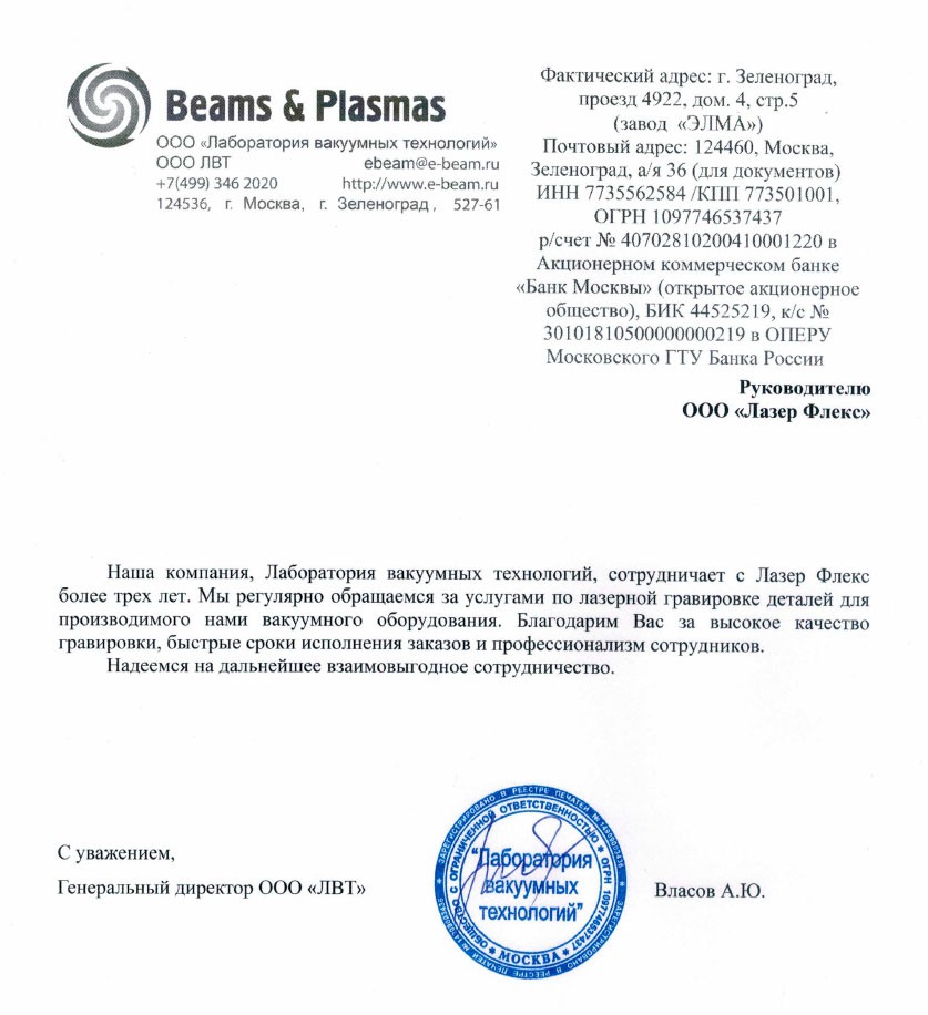 Наша компания выражает свою благодарность производственной компании ООО «Лазер Флекс».
